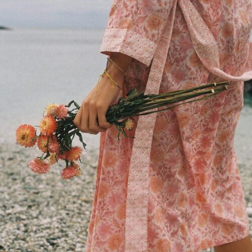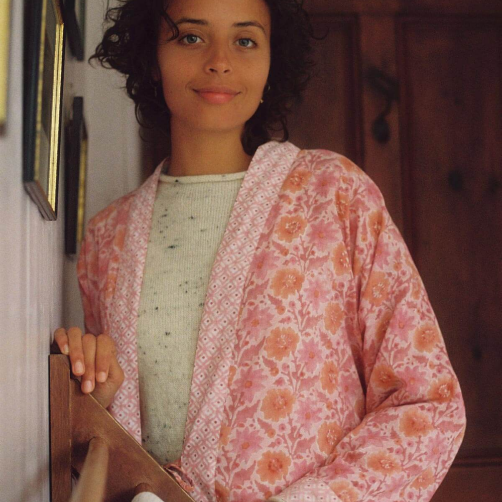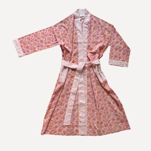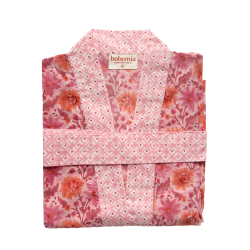 The vintage pink robe with deep and dusty pink accents showcases Bohemia Design's bold Floribunda botanical print, complemented by the charming Ditsy print on the cuffs, pockets, trim, and belt.